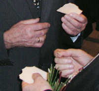 die wird vor dem essen in die hand genommen (jeder hat eine) und man geht zur einer person und brecht ein kleines stück von der anderen person die oblate ab und sagt wünsche für das jahr zb gesundheit erfolg in schule beruf usw dann macht der generische das gleiche bei dir und das macht man mit jedem der am essen beteiligt ist dies macht man auch mit nachbarn am nächsten tag oder man verschikt ein stück der oblate in weihnachtsgrußkarten (sehe auch bilder 1 und 2)