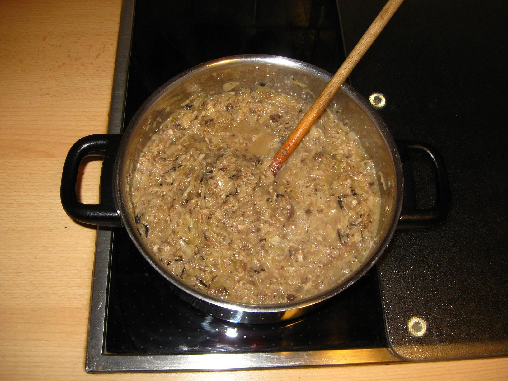 Pilze in Wasser einweichen (Min. 2 Std), danach kochen, bis sie weich sind (~0,5 Std); sieben, fein schneiden (Wasser nicht wegschütten).