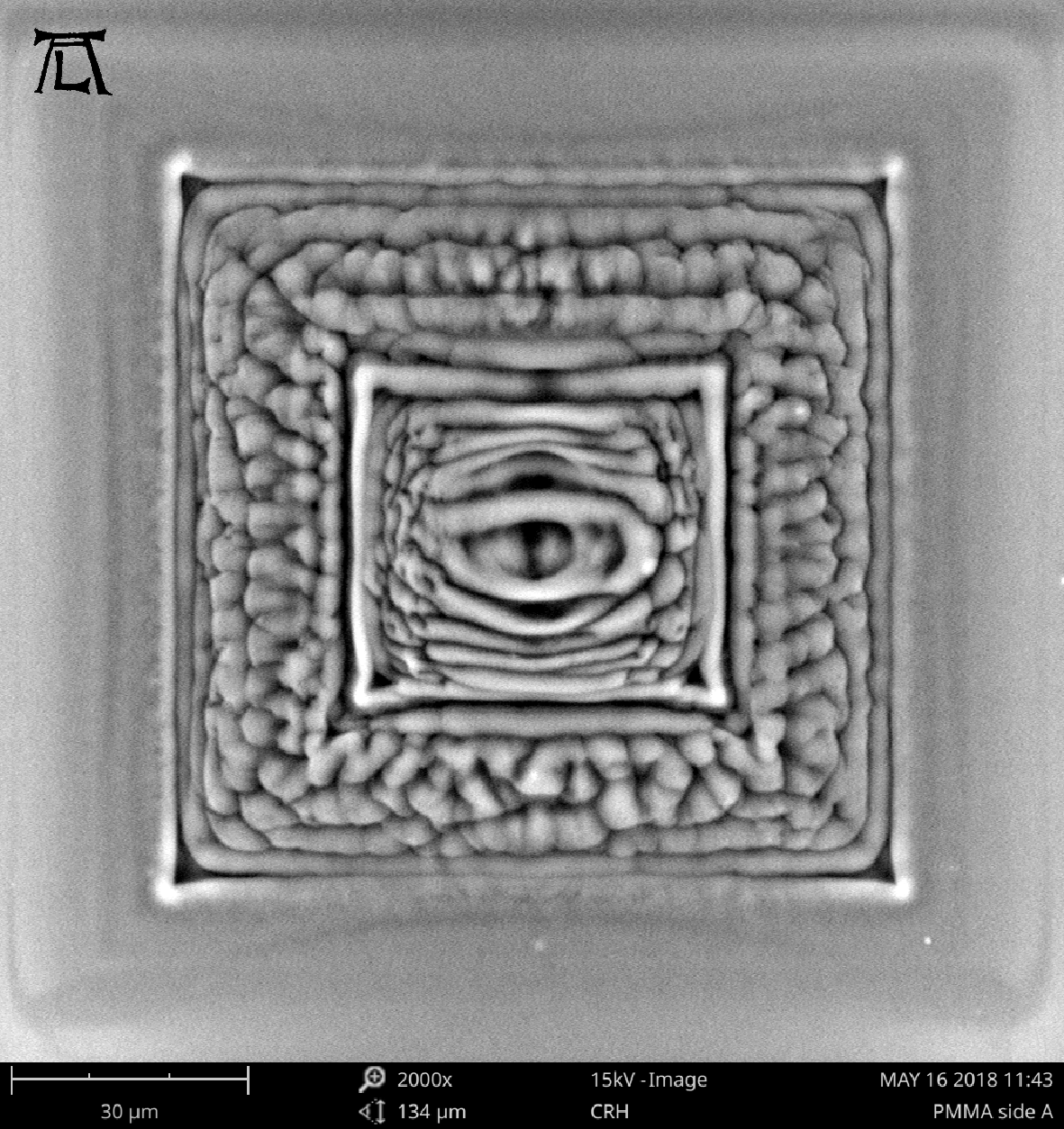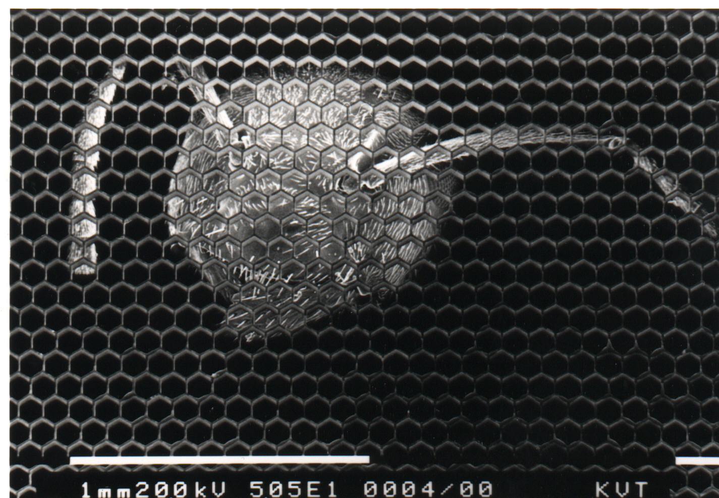 Anbei ein schönen Bild von der Arbeit: Was man sieht ist eine mit 10µm Silber beschichtete PMMA-Foie unter dem Rasterelektronenmikroskop. Durch eine zu hohe Beschleunigungsspannung des Mikroskops wurde die Silberschicht zerstört und das PMMA darunter etwas angeschmolzen. Ergebnis: Wissenschaftlich fraglich aber künstlerisch doch wertvoll ![]()